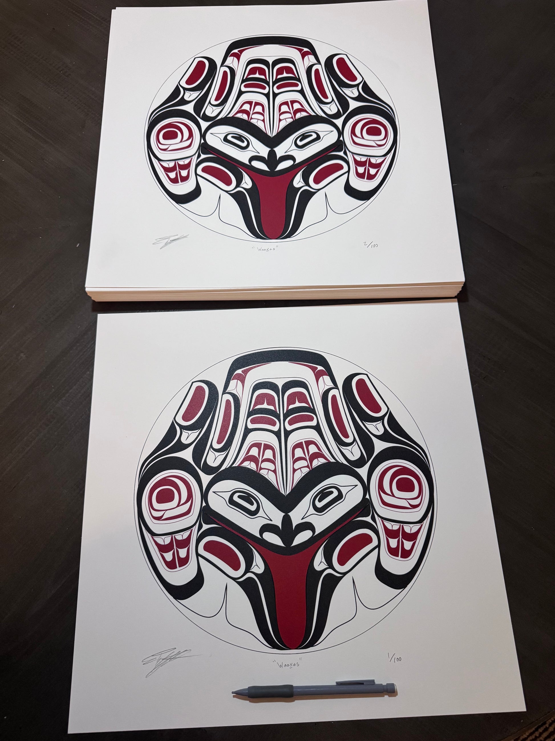 This distinguished 16 by 16 inch print celebrates the Frog (Waaxas), a symbol across Indigenous cultures representing prosperity and protection against loss. The imagery captures profound spiritual significance. This limited-edition release of approximately 100 prints offers collectors an opportunity to own a meaningful work.